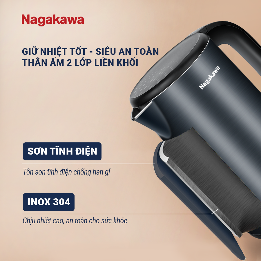 Ấm siêu tốc 1.8L Nagakawa NAG0319 có thiết kế tối giản, màu xanh lam sang trọng thu hút mọi ánh nhìn. Sản phẩm được cấu tạo từ inox liền khối tạo cảm giác tinh tế, “gọn gàng” và đặc biệt hơn so với các ấm siêu tốc khác.