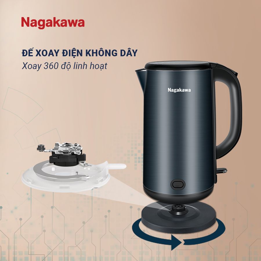 Ấm siêu tốc thủy tinh Nagakawa NAG0317 có đế tiếp điện xoay 360 độ tiện lợi, dễ dàng xoay nhiều góc độ khi sử dụng.