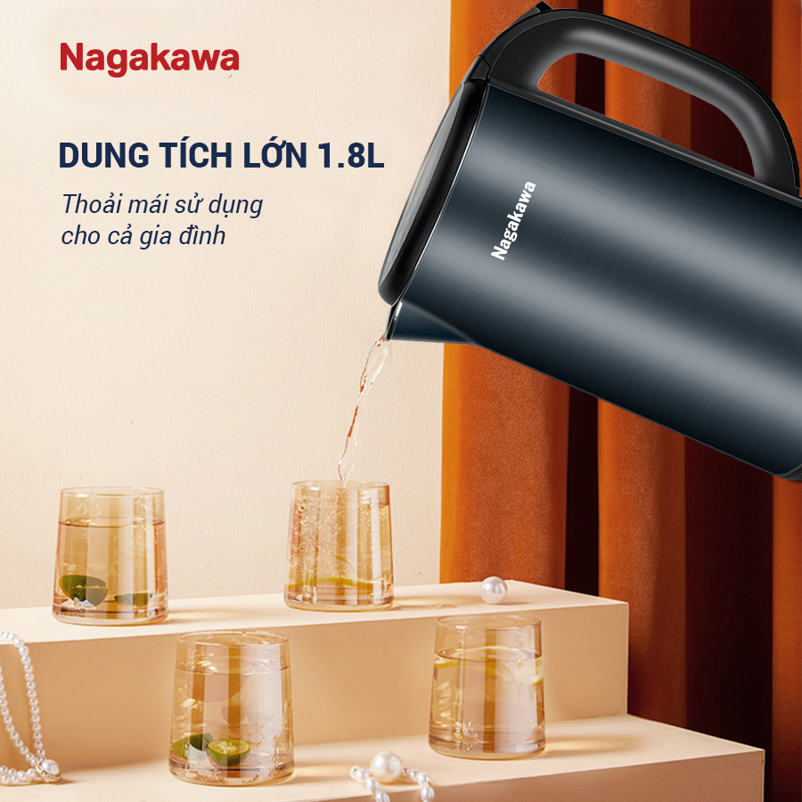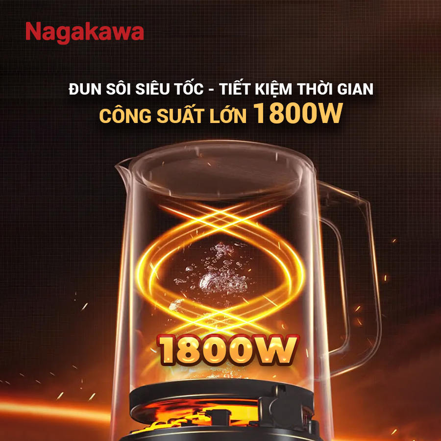 Ấm siêu tốc 1.8L Nagakawa NAG0320 có công suất là 1800W. Công suất cực đại này giúp nước sôi nhanh chóng, rút ngắn thời gian đun nấu. Phục vụ kịp thời trong trường hợp pha sữa cho bé, nhà có khách, nấu ăn,...