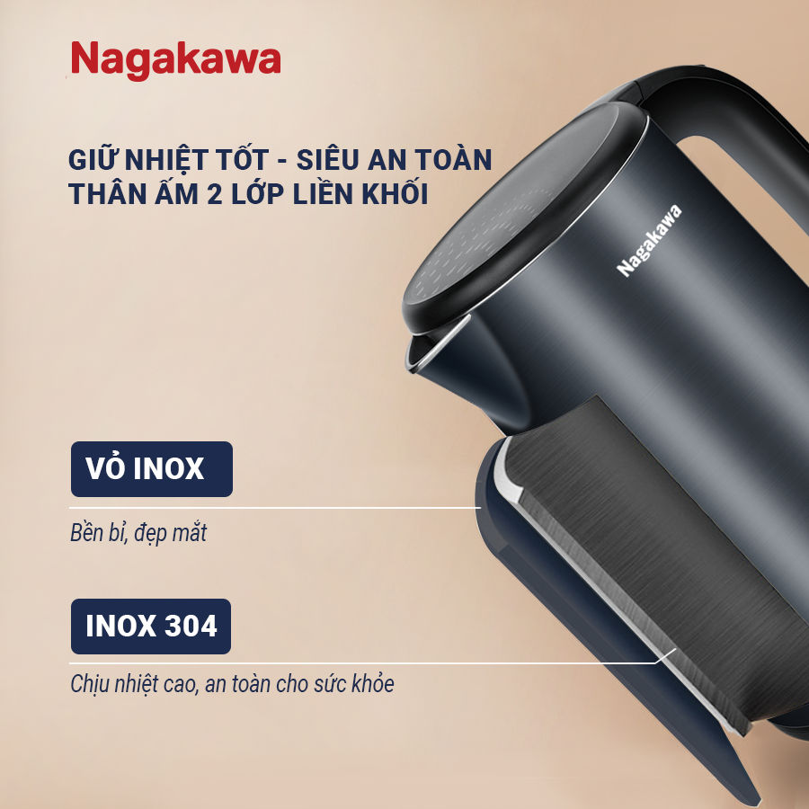 Ấm siêu tốc Nagakawa NAG0320 (1.8L ) có thiết kế tối giản, sắc đen bóng sang trọng thu hút mọi ánh nhìn. Sản phẩm được cấu tạo từ inox liền khối tạo cảm giác tinh tế, “gọn gàng” và đặc biệt hơn so với các ấm siêu tốc khác.