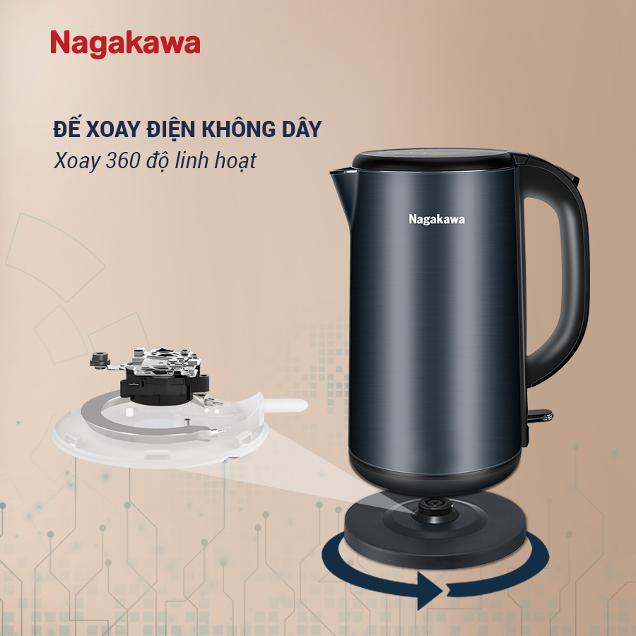 Ấm siêu tốc thủy tinh Nagakawa NAG0320 có đế tiếp điện xoay 360 độ tiện lợi, dễ dàng xoay nhiều góc độ khi sử dụng.
