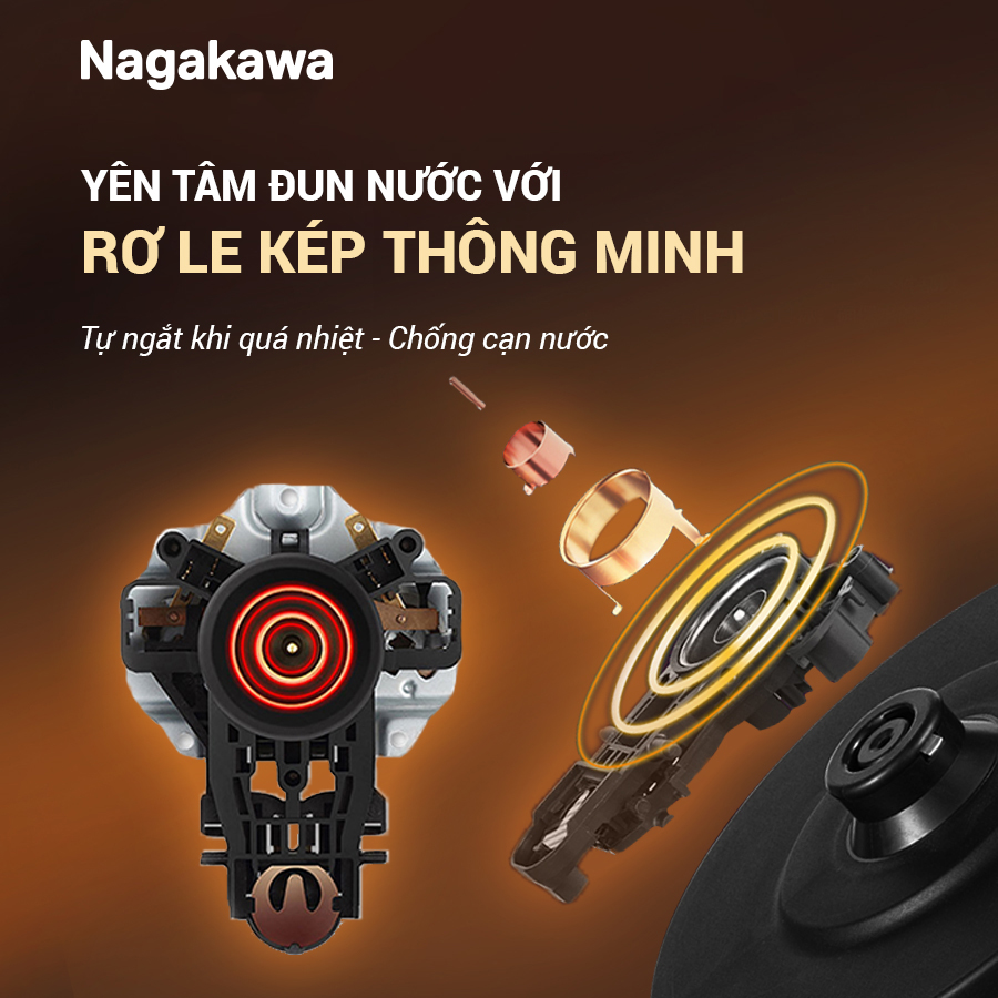Ấm siêu tốc thủy tinh Nagakawa NAG0320 được trang bị rơ le tự ngắt khi nước sôi tới một nhiệt độ nhất định. Chức năng này có tác dụng là: chống cạn nước, bảo vệ ấm, hạn chế chập cháy và các sự cố không đáng có khi đun nấu. Người dùng cũng không cần theo sát quá trình đun nước để ngắt điện sau khi nước sôi.