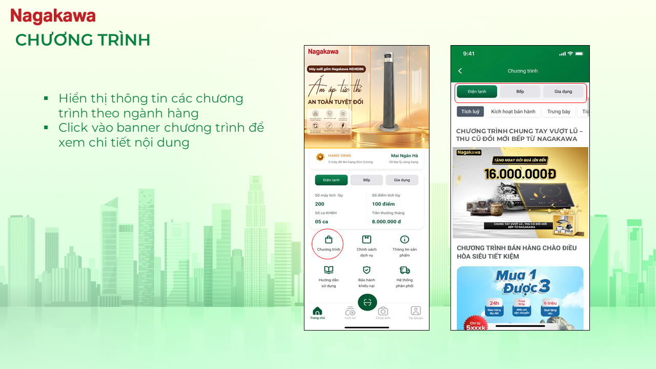 My Nagakawa còn là kênh tương tác nội bộ hiệu quả, nơi các đại lý có thể tham gia thi đua trưng bày sản phẩm, cập nhật chương trình khuyến mãi, chính sách trả thưởng hoặc sự kiện mới nhất của Nagakawa.