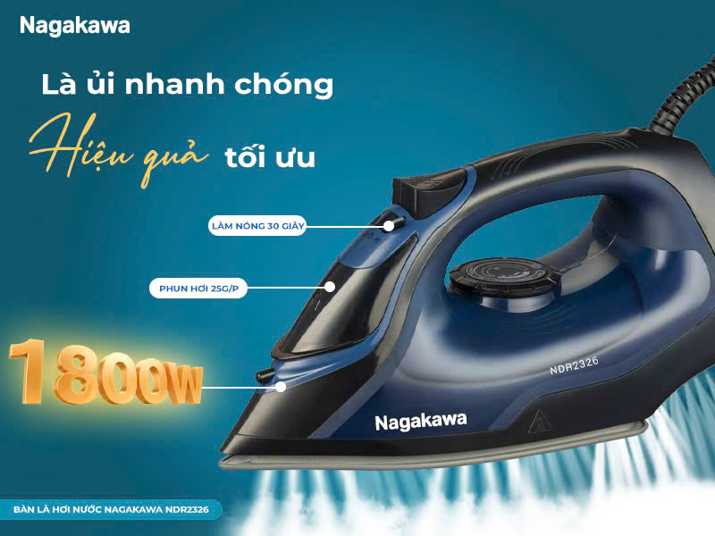 Với công suất mạnh 1800W, bàn là đạt nhiệt độ tối ưu chỉ trong 30 giây, tiết kiệm thời gian cho những buổi sáng vội vàng. Tốc độ phun hơi liên tục 25g/phút giúp làm mềm và duỗi phẳng sợi vải nhanh chóng, loại bỏ nếp nhăn cứng đầu chỉ sau vài lượt ủi. Ngoài ra, Bàn là hơi nước Nagakawa NDR2326 còn trang bị hơi nước tăng cường (Steam Boost) đạt 0.3–0.7g cho tác dụng phẳng sâu ở những điểm khó ủi.