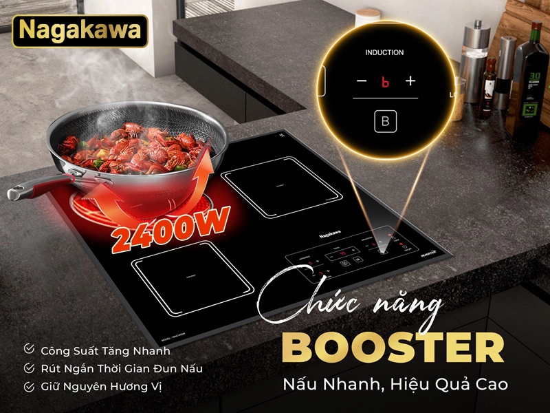 Khi lựa chọn chức năng Booster, công suất bếp 2 điện từ 1 hồng ngoại Nagakawa NAG1253M sẽ nhanh chóng được đẩy lên mức cực đại trong thời gian cực ngắn và hoạt động liên tục trong thời gian 5 phút, giúp rút ngắn tối đa thời gian đun nấu. Cụ thể, công suất bếp mặc định ở mức 1 là 400W, nếu chọn chức năng Booster, bếp nhanh chóng đạt công suất cực đại từ 2400W.