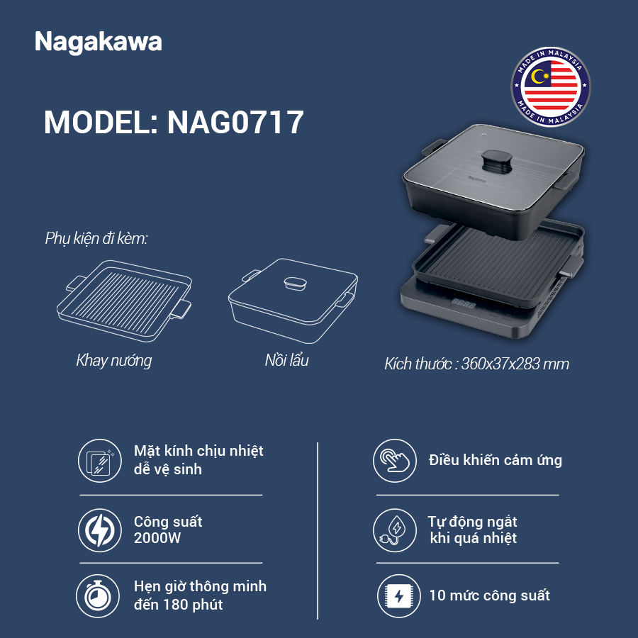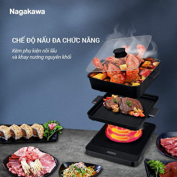 Bếp điện từ đơn Nagakawa NAG0717 được tặng kèm nồi lẩu và vỉ nướng nguyên khối. Nồi và vỉ nướng cùng màu với bếp từ mang lại sự đồng bộ và tiện dụng hơn khi nấu nướng.