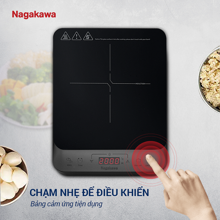 Bếp từ đơn Nagakawa NAG0717 sử dụng bảng điều khiển cảm ứng tiện dụng, dễ dàng điều khiển bằng những “cú chạm” nhẹ nhàng. Bảng điều khiển bao gồm ký hiệu và chữ để người dùng nhận diện, sử dụng. Các phím lần lượt là: