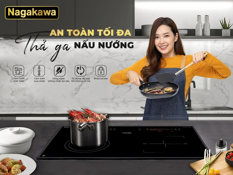 - Chống nhiệt lan tỏa, tự nhận diện vùng nấu, cảm ứng quá nhiệt, cảm ứng trào nước và khóa an toàn
