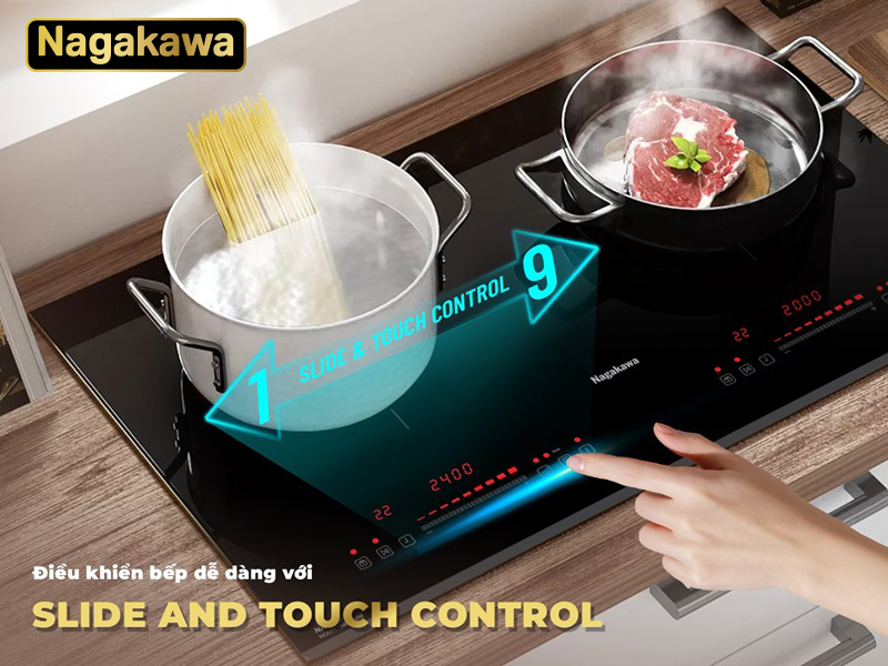 Với bếp đôi điện từ Nagakawa NK2C02M, bạn có thể quyết định cách điều chỉnh tăng giảm công suất bằng cách vuốt di chuyển trái, phải hoặc trực tiếp ấn phím điều chỉnh 9 mức công suất. Chỉ cần chạm nhẹ vào phím điều chỉnh để lựa chọn, thao tác rất mượt mà, nhanh chóng và chính xác.
