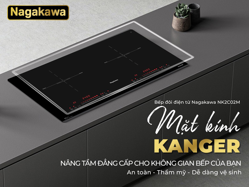 Bếp đôi điện từ Nagakawa NK2C02M sử dụng mặt kính Kanger từ thương hiệu mặt kính nổi tiếng được thiết kế mài vát một cạnh tinh tế, bo viền nhôm sang trọng, mang lại vẻ đẹp hiện đại cho căn bếp của bạn.