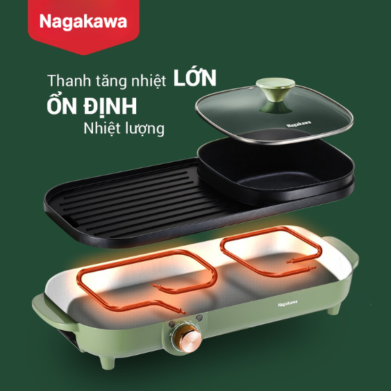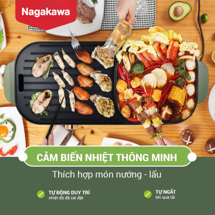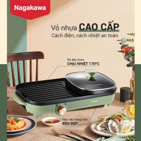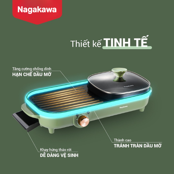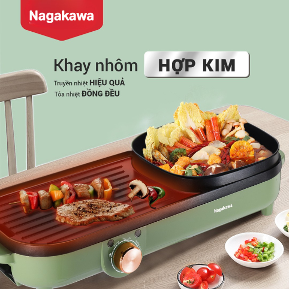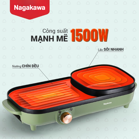 Bếp nướng điện Nagakawa là sự kết hợp tiện lợi của bếp nướng và nồi lẩu, với tổng công suất 1500W mạnh mẽ, nhanh chóng kích hoạt đồng thời cả 2 vùng nướng và lẩu một cách hiệu quả, đáp ứng cùng lúc nhu cầu đa dạng cho 3-6 người,mang đến trải nghiệm hài lòng cho các bữa tiệc tại gia.