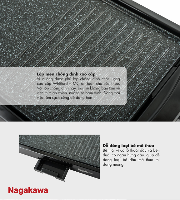 Ngoài ra với lớp chống dính này cũng rất dễ lau chùi khi vệ sinh. Bếp nướng điện Nagakawa NAG3101 không tiêu hao nhiều dầu, tiết kiệm nguyên liệu mà vẫn đảm bảo ngon nhất.