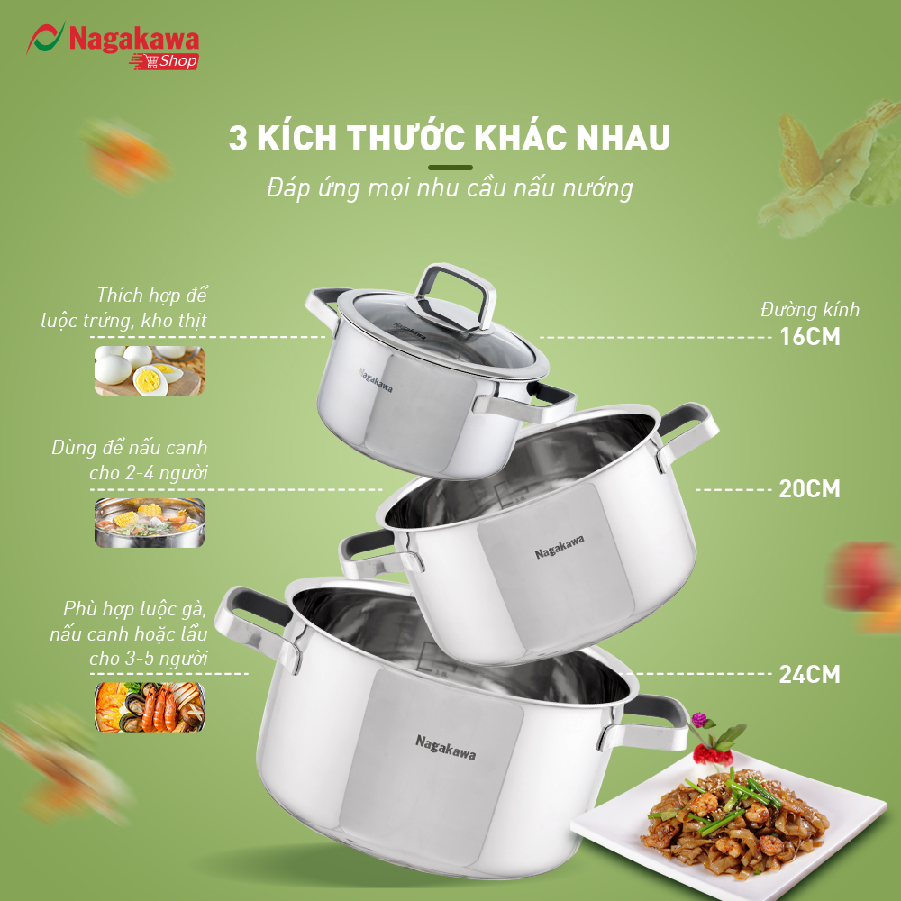 Bộ 3 nồi inox Nagakawa NAG1353 bao gồm 3 nồi với 3 kích thước khác nhau: 16cm, 20cm, 24cm dễ dàng đáp ứng đầy đủ các nhu cầu nấu nướng mọi món ăn. Nồi nhỏ 16cm thích hợp để luộc trứng, kho thịt, nồi cỡ trung 20cm để nấu canh cho 2-4 người và nồi lớn 24cm có thể luộc gà, nấu canh hoặc lẩu cho 3-5 người.