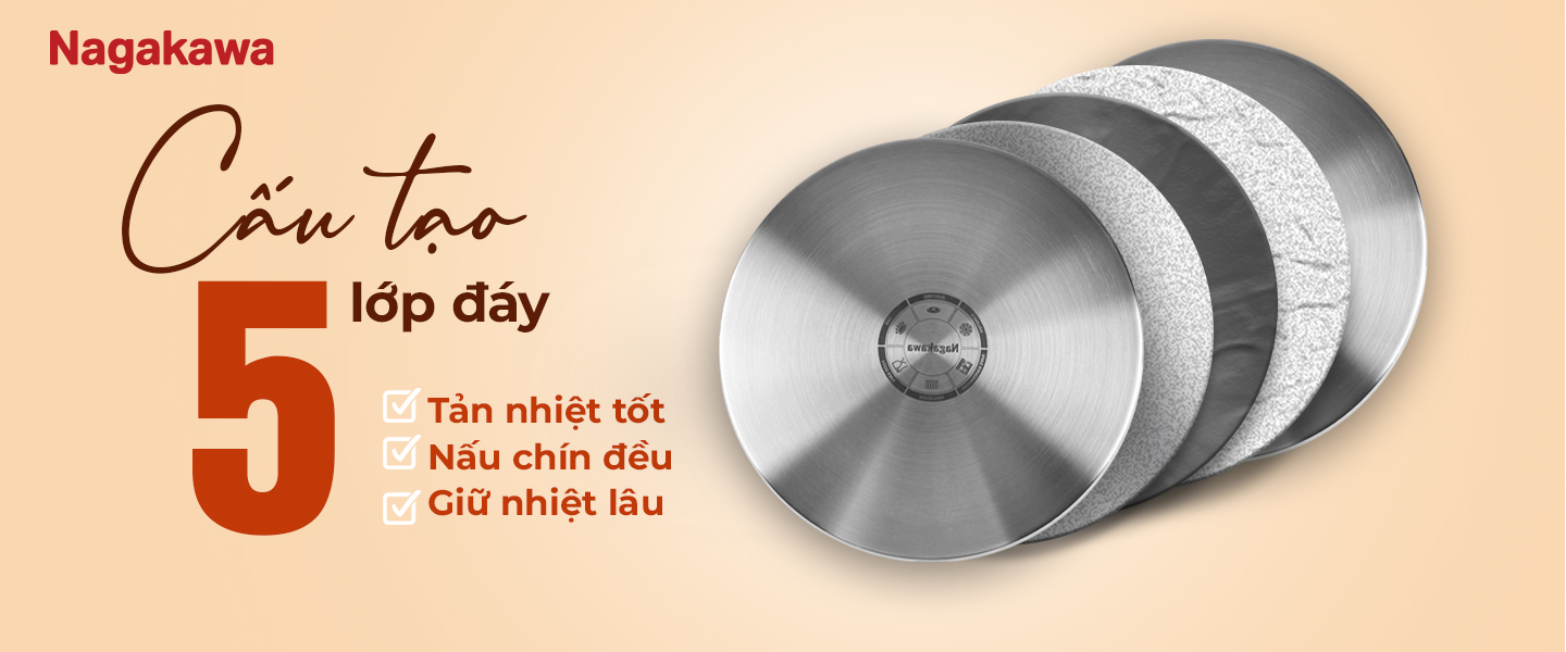 - Cấu tạo đáy 5 lớp giúp tản nhiệt tốt, nấu chín đều, giữ nhiệt lâu