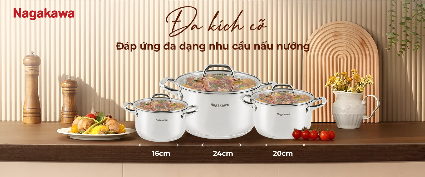 Bộ nồi inox Nagakawa NAG1360 bao gồm 3 nồi có đường kính 16cm, 20cm và 24cm phù hợp với đa dạng nhu cầu nấu nướng cùng lúc trong bữa ăn, nhờ đó tiết kiệm thời gian và nhiên liệu tối đa, đồng thời tối ưu hóa quá trình nấu nướng và thỏa mãn mọi khẩu vị.