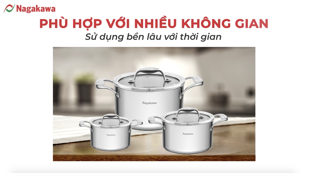 Bộ nồi inox NAG1355 gồm 3 kích cỡ: 16,20,24cm, đáp ứng đa dạng nhu cầu nấu nướng từ các món kho, luộc, nấu… cho gia đình từ 2-6 người, phù hợp với đa số gia đình. Đồng thời, Bộ nồi inox NAG1355 có thể được sử dụng được trên mọi loại bếp như: bếp từ, bếp gas, bếp điện,... tiện lợi trong sử dụng.
