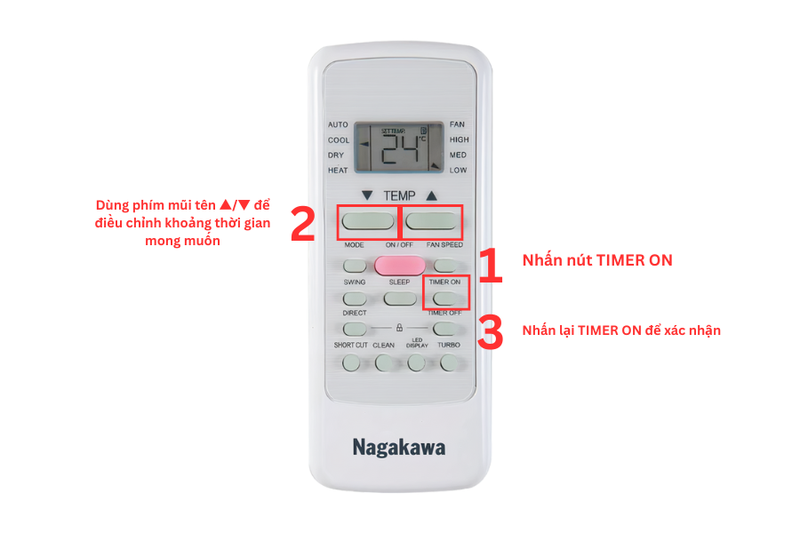 Thao tác hẹn giờ bật điều hòa Nagakawa.
