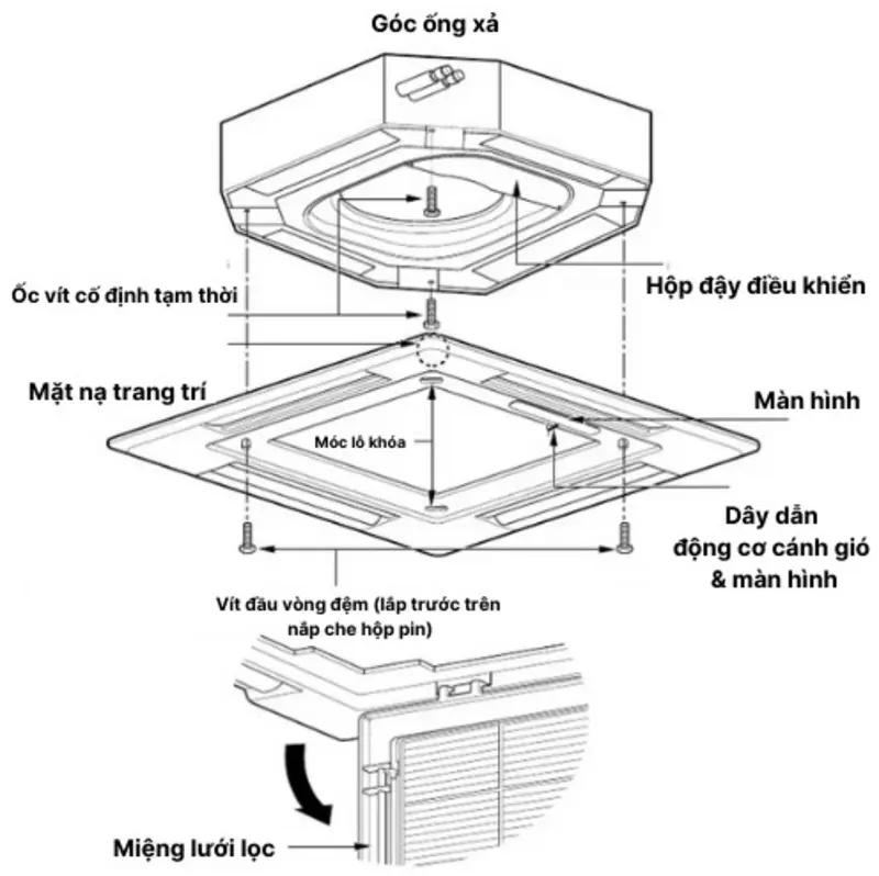 Điều hòa âm trần (Cassette) là loại điều hòa được lắp đặt chìm trong trần, chỉ để lộ phần mặt nạ và cửa gió ra bên ngoài. Thiết kế này không chỉ giúp không gian gọn gàng, thẩm mỹ hơn mà còn hỗ trợ luồng khí lạnh lan tỏa đều theo nhiều hướng. Cấu tạo điều hòa âm trần vẫn bao gồm hai phần chính là dàn lạnh và dàn nóng, nhưng được tối ưu lại về cấu trúc và vị trí lắp đặt để phù hợp với các không gian rộng và yêu cầu phân phối gió hiệu quả hơn so với dòng treo tường.