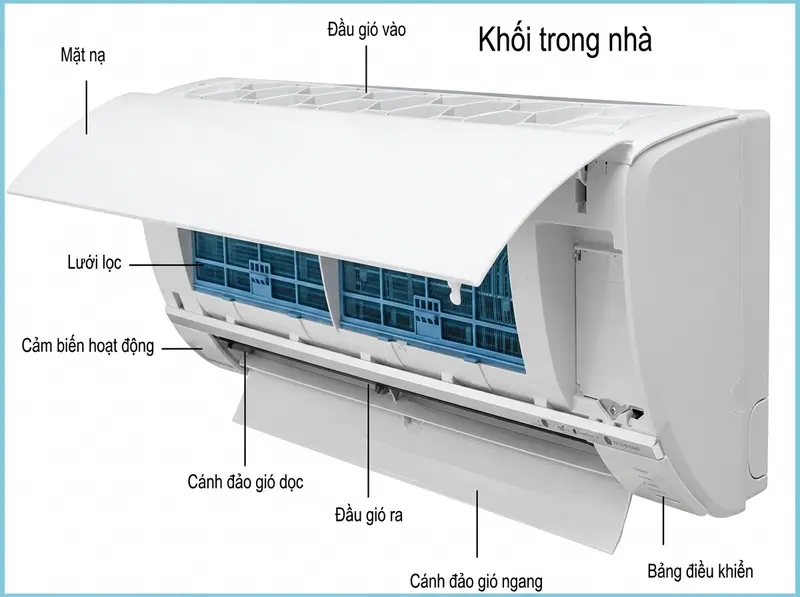 - Bộ lọc khí: Lọc bụi và tạp chất trước khi không khí đi qua dàn lạnh. Nếu được bảo trì đúng cách, bộ phận này giúp duy trì hiệu suất làm lạnh và cải thiện chất lượng không khí đầu ra.