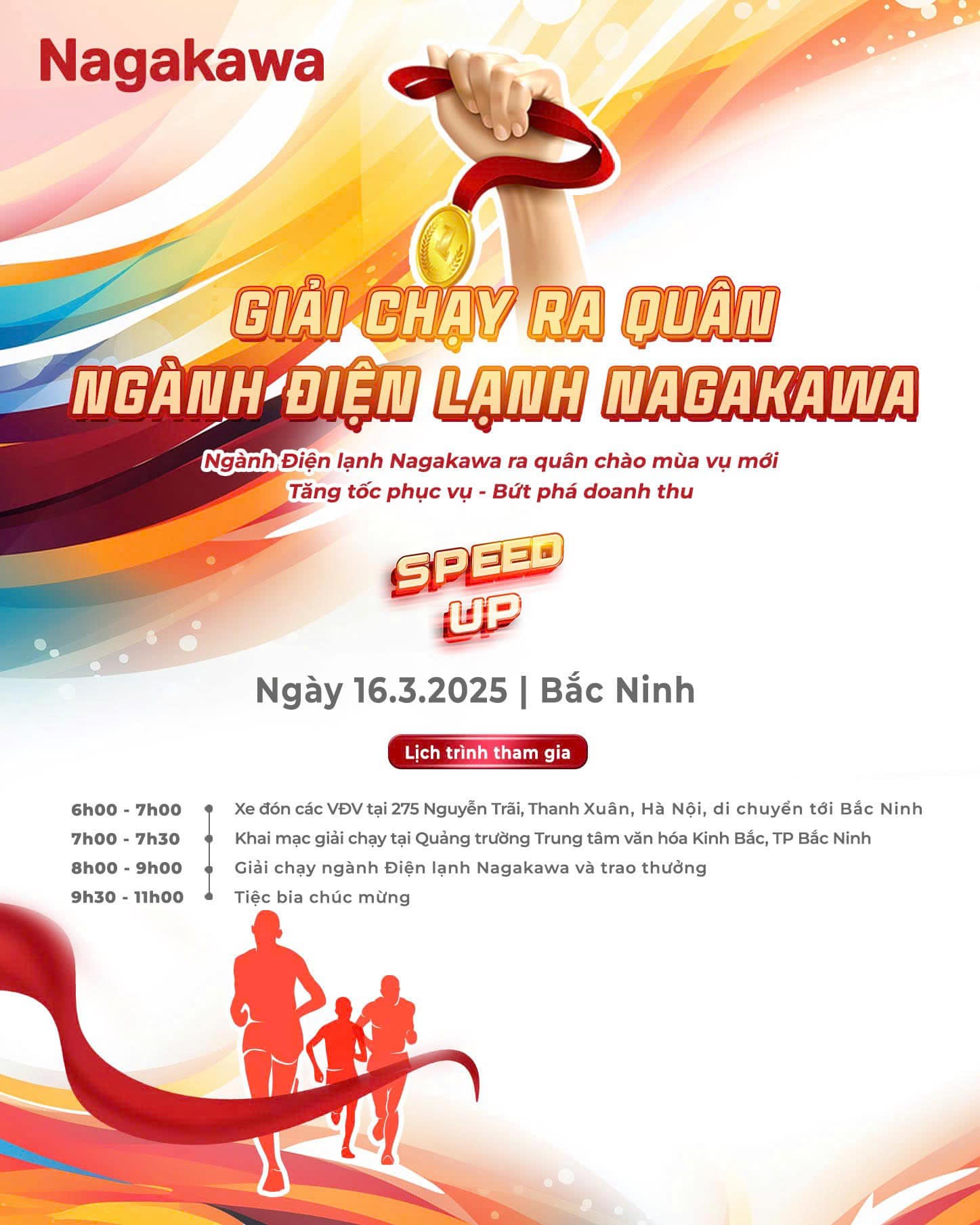 Vào ngày 16/03/2025 tới đây, tại Quảng trường Trung tâm văn hóa Kinh Bắc, TP Bắc Ninh, giải chạy ngành điện lạnh Nagakawa sẽ chính thức khởi động với chủ đề đầy năng lượng: “Tăng tốc phục vụ - Bứt phá doanh thu”. Đây là sự kiện thể thao nội bộ được tổ chức nhằm khích lệ tinh thần làm việc, kết nối đội ngũ nhân viên và khởi động một mùa vụ mới đầy hứa hẹn.