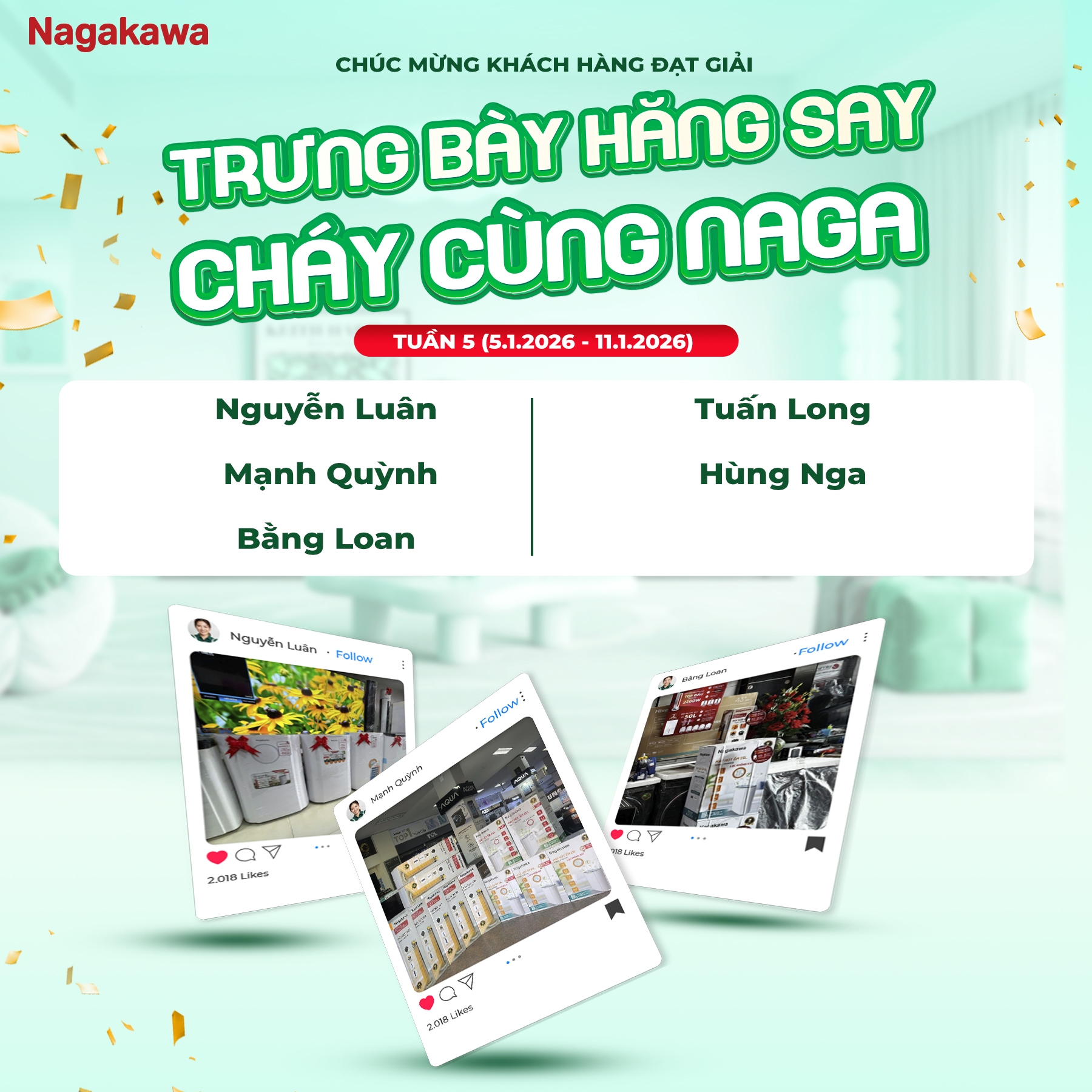 Trong Tuần 5 (05/01/2026 - 11/01/2026) cuộc thi “Trưng bày hăng say - Cháy cùng Nagakawa”, các Đại lý trên khắp mọi miền đất nước đã cùng Nagakawa khép lại một hành trình với danh sách 5 gương mặt xuất sắc Tuần 5.