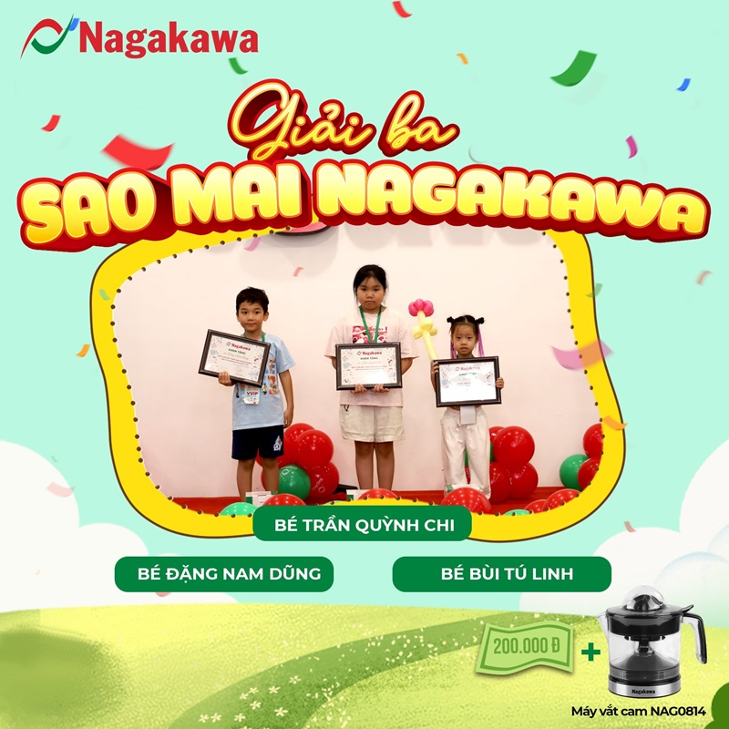 Giải Ba Sao Mai Nagakawa thuộc về bé Đặng Nam Dũng, bé Trần Quỳnh Chi và bé Bùi Tú Linh. Bên cạnh đó, Nagakawa còn trao giải cho các bé thuộc TOP 20 Tài Năng Nhí Nagakawa 2024.