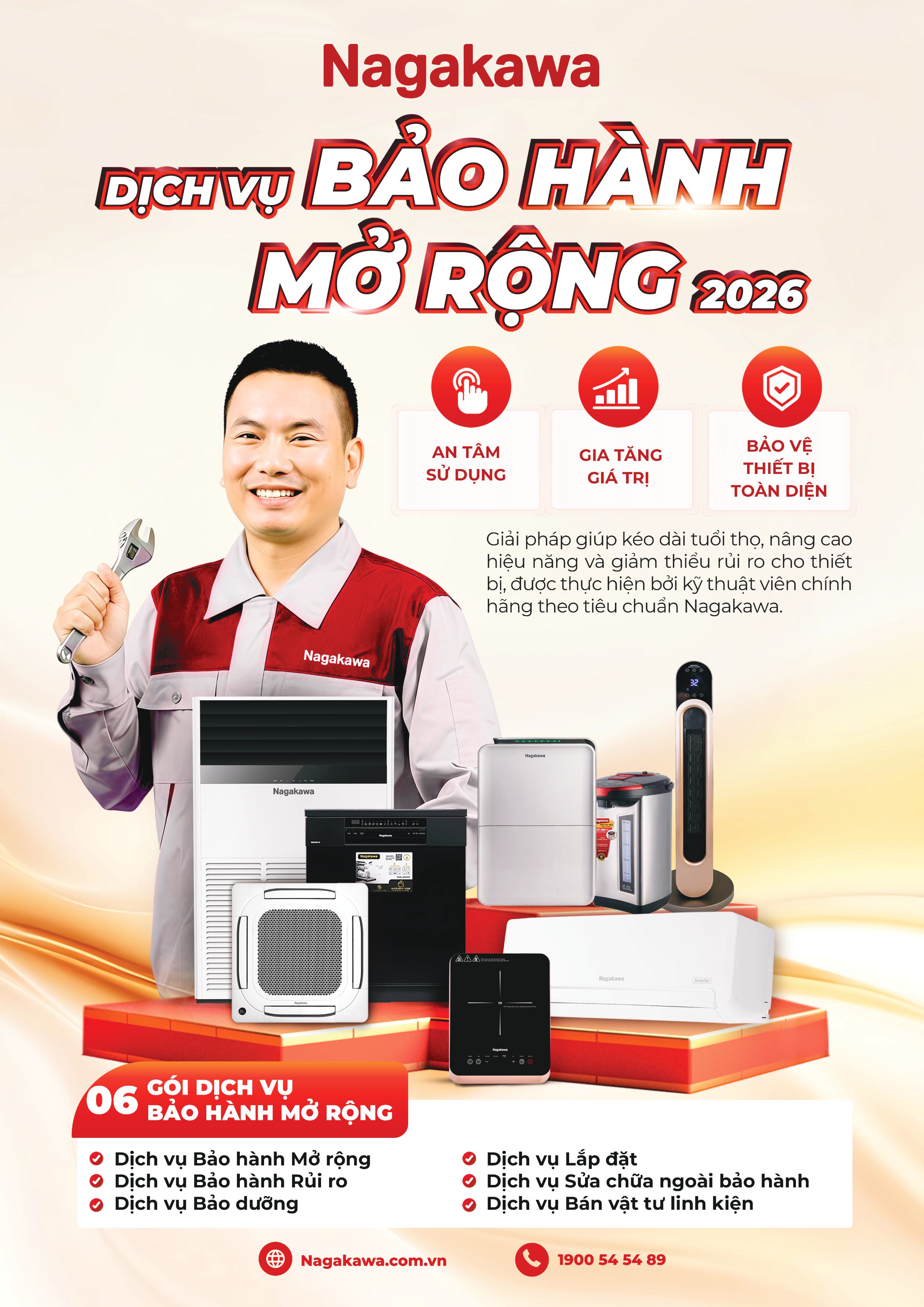 Với mong muốn mang đến sự an tâm và trải nghiệm tốt hơn cho khách hàng, Nagakawa chính thức ra mắt Dịch vụ Bảo hành Mở rộng Nagakawa 2026 – hệ thống dịch vụ chăm sóc thiết bị toàn diện giúp kéo dài tuổi thọ sản phẩm, gia tăng giá trị sử dụng và giảm thiểu rủi ro trong quá trình vận hành