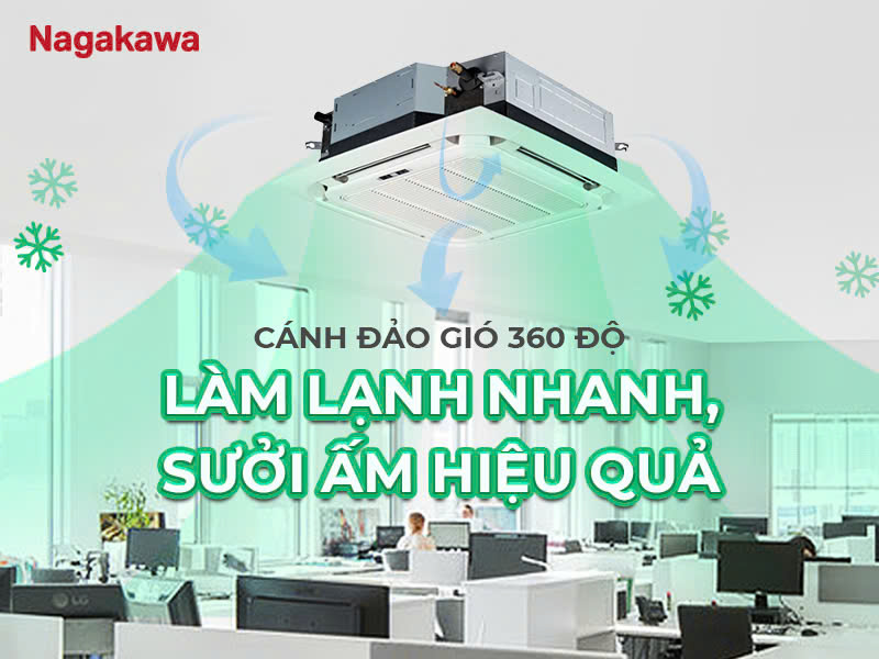 Điều hòa âm trần Cassette Nagakawa NT-A36R1T20 được trang bị cánh đảo gió tự động 360 độ, kết hợp cùng quạt gió 4 tốc độ và lưu lượng gió cao 1600m3/h, giúp phân phối không khí mát lạnh hoặc ấm áp đều khắp mọi ngóc ngách trong không gian.