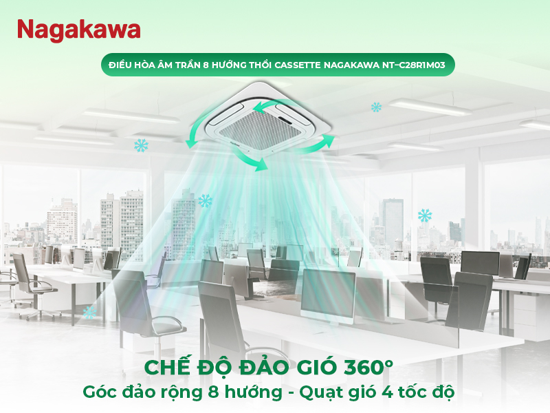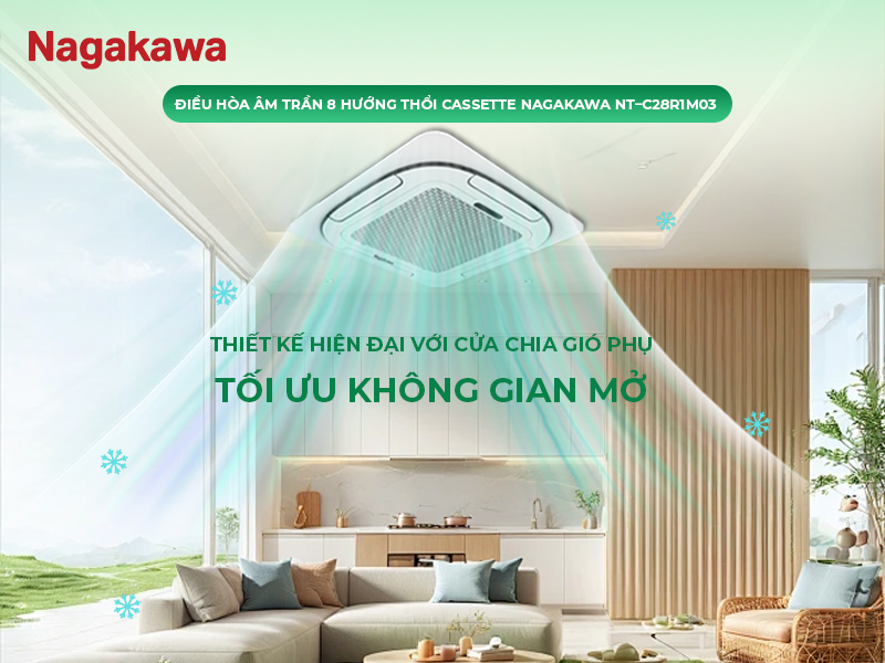 Bạn đang tìm kiếm một sản phẩm điều hòa âm trần mạnh mẽ, tiết kiệm điện, phù hợp cho không gian rộng như văn phòng, cửa hàng hoặc phòng khách? Điều hòa âm trần 8 hướng thổi Cassette Nagakawa NT–C28R1M03 là sự lựa chọn hoàn hảo. Với công suất 28.000BTU, thiết kế 8 hướng thổi, khả năng tiết kiệm năng lượng, cùng công nghệ tiên tiến, sản phẩm này đảm bảo mang lại luồng không khí trong lành, thoải mái cho mọi không gian