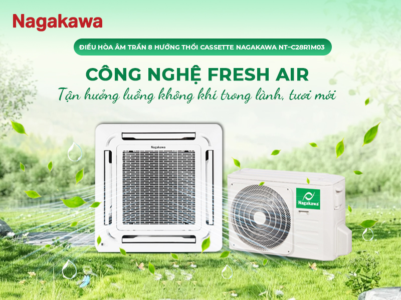 Điều hòa âm trần 8 hướng thổi Cassette Nagakawa NT-C28R1M03 được trang bị công nghệ Fresh Air, giúp dẫn không khí tươi từ bên ngoài vào phòng. Tính năng này giúp người dùng thấy được không gian thoáng đãng, sạch sẽ và mát mẻ, nâng cao chất lượng không khí trong phòng.