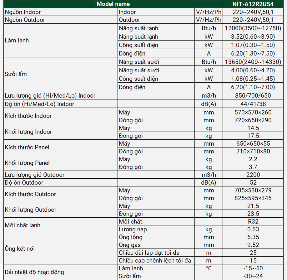 Với NIT-A12R2U54, một chiếc điều hòa âm trần cassette 2 chiều thông minh, mọi vấn đề về điều hòa không khí sẽ được giải quyết một cách tối ưu: gọn gàng, mạnh mẽ, tiết kiệm điện và thân thiện với người sử dụng. NIT-A12R2U54 được trang bị chức năng 2 chiều, có khả năng vừa làm lạnh vào mùa hè vừa sưởi ấm vào mùa đông – một lựa chọn hoàn hảo cho những khu vực có khí hậu biến đổi theo mùa. Nhờ đó, bạn không cần đầu tư thêm thiết bị sưởi riêng, tiết kiệm cả chi phí và không gian lắp đặt, đồng thời đảm bảo không khí dễ chịu quanh năm cho mọi người trong văn phòng, nhà hàng hoặc khu lưu trú.