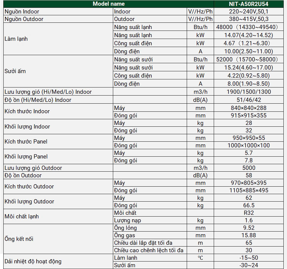 Với NIT-A50R2U54, một chiếc điều hòa âm trần cassette 2 chiều thông minh có công suất lên tới 50.000 BTU/h, mọi vấn đề về điều hòa không khí sẽ được giải quyết một cách tối ưu: gọn gàng, mạnh mẽ, tiết kiệm điện và thân thiện với người sử dụng. NIT-A50R2U54 được trang bị chức năng 2 chiều, có khả năng vừa làm lạnh vào mùa hè vừa sưởi ấm vào mùa đông – một lựa chọn hoàn hảo cho những khu vực có khí hậu biến đổi theo mùa. Nhờ đó, bạn không cần đầu tư thêm thiết bị sưởi riêng, tiết kiệm cả chi phí và không gian lắp đặt, đồng thời đảm bảo không khí dễ chịu quanh năm cho mọi người trong văn phòng, nhà hàng hoặc khu lưu trú.