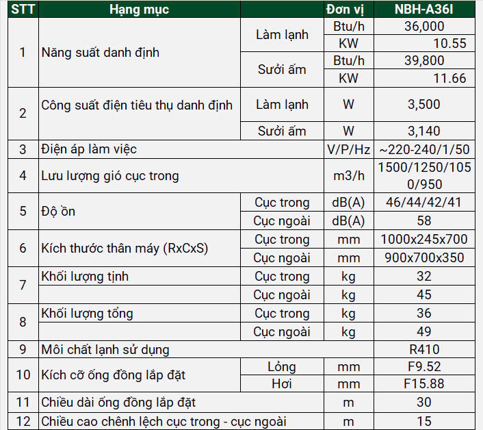 Với thiết kế âm trần tinh tế và công nghệ Inverter tiên tiến, điều hòa âm trần nối ống gió Inverter NBH-A36I 2 chiều mang đến hiệu suất làm mát và sưởi ấm tối ưu cho các không gian từ 45–60 m². Sản phẩm đáp ứng nhu cầu sử dụng quanh năm, đồng thời đảm bảo tiết kiệm năng lượng và vận hành êm ái.