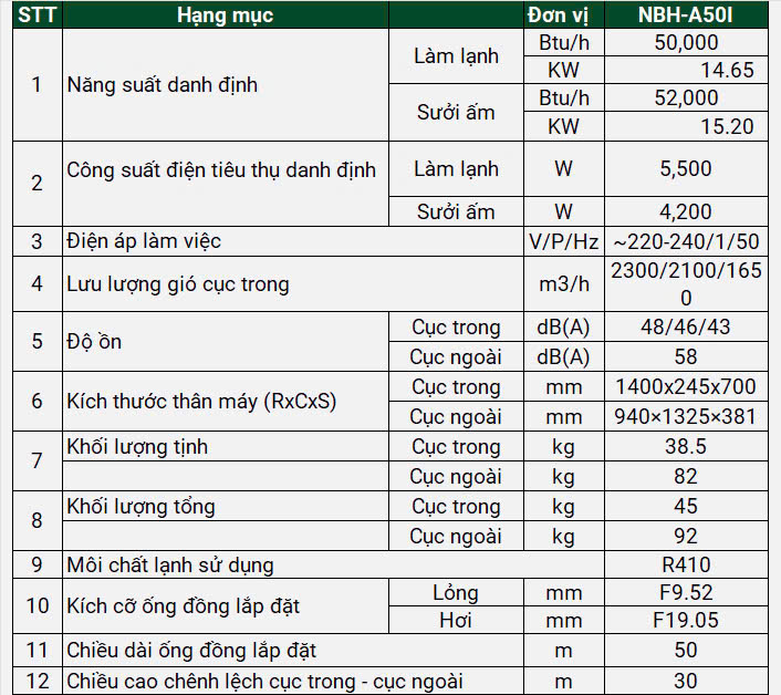 Sản phẩm được thiết kế để hoạt động hiệu quả trong dải nhiệt độ rộng từ -15°C đến 49°C, phù hợp với nhiều điều kiện khí hậu khác nhau. Dù là mùa đông lạnh giá hay những ngày hè oi ả, thiết bị vẫn duy trì hiệu quả vận hành bền bỉ. Điều hòa âm trần nối ống gió Inverter NBH-A50I 2 chiều là lựa chọn lý tưởng cho những ai tìm kiếm một giải pháp điều hòa không khí hiệu quả, tiết kiệm và linh hoạt cho không gian sống hoặc làm việc.