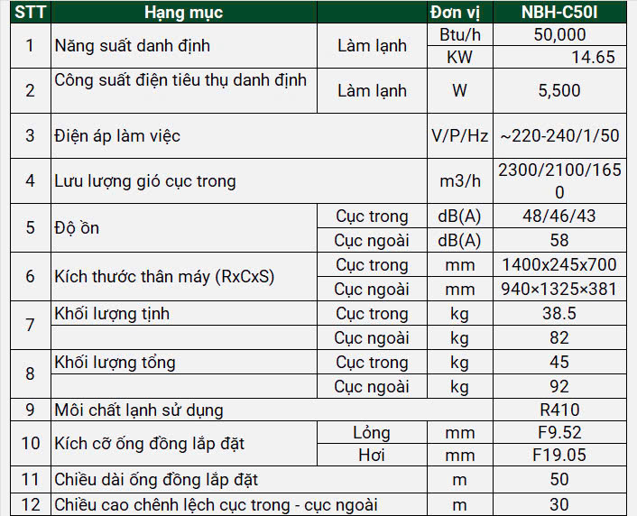 Không chỉ làm lạnh hiệu quả, NBH-C50I còn sử dụng môi chất lạnh R410A, được biết đến là loại gas thân thiện với môi trường, không phá hủy tầng ozone và được các quốc gia phát triển khuyến khích sử dụng. Đây là lựa chọn lý tưởng cho những công trình hướng tới tính bền vững, như chuỗi cửa hàng, văn phòng doanh nghiệp hoặc dự án thương mại cao cấp.