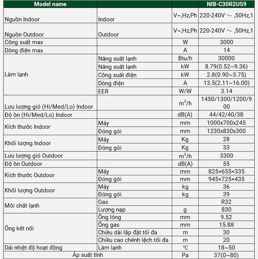 Với công suất phù hợp cho không gian từ 40–50m², Điều hòa âm trần nối ống gió Inverter NIB-C30R2U59 1 chiều là lựa chọn hiệu quả cho môi trường làm việc, cửa hàng hoặc phòng họp vừa. Nhờ công nghệ Inverter và hệ thống điều chỉnh lưu lượng gió linh hoạt, sản phẩm giúp duy trì sự thoải mái ổn định mà vẫn tiết kiệm năng lượng và giảm thiểu tiếng ồn trong suốt quá trình vận hành.
