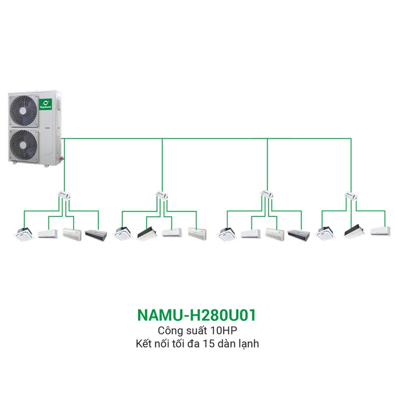 Dòng máy mạnh nhất của Nagakawa Mini VRF, kết nối tới 15 dàn lạnh, phù hợp công trình lớn, vận hành bền bỉ trong môi trường khắc nghiệt. |