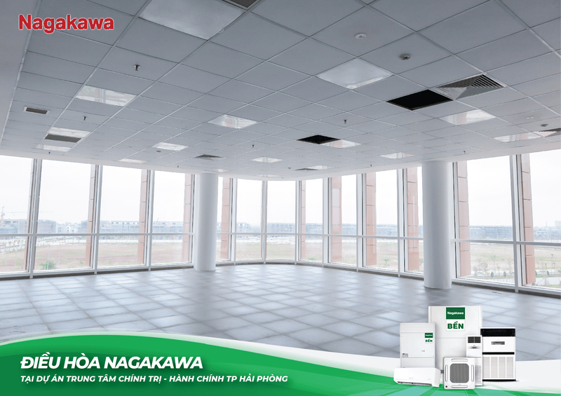 Hệ thống điều hòa: Nagakawa tư vấn, thiết kế và lắp đặt hệ thống điều hòa trung tâm VRF hiện đại, sử dụng các cục nóng công suất 40HP kết hợp dàn lạnh âm trần cassette, đảm bảo khả năng làm mát hiệu quả vào mùa hè, đáp ứng nhu cầu sử dụng đa dạng của cả tòa nhà làm việc và hội trường.