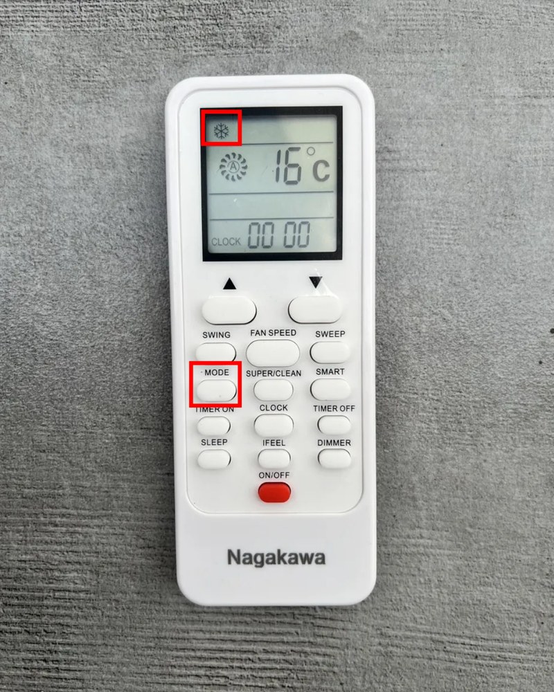 Bước 1: Bạn nhấn liên tục nút Mode trên điều khiển cho đến khi màn hình hiển thị đã chuyển sang chế độ Cool (hình hoa tuyết).