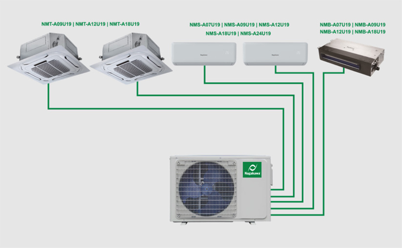 Điều hòa Multi DC Inverter 42000BTU/h 2 chiều NMU-A42UB 5 dàn lạnh của Nagakawa có thể kết hợp với 3 loại điều hòa: treo tường, âm trần Cassette và âm trần nối ống gió.