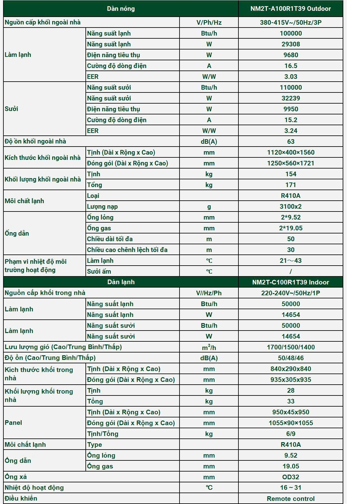 NM2T-A100R1T39 được thiết kế đặc biệt với khả năng kết nối cùng lúc 2 dàn lạnh âm trần cassette. Ưu điểm này giúp phân phối luồng khí mát đồng đều khắp không gian, loại bỏ hoàn toàn các góc khuất, mang đến cảm giác mát lạnh dễ chịu cho mọi vị trí trong phòng.