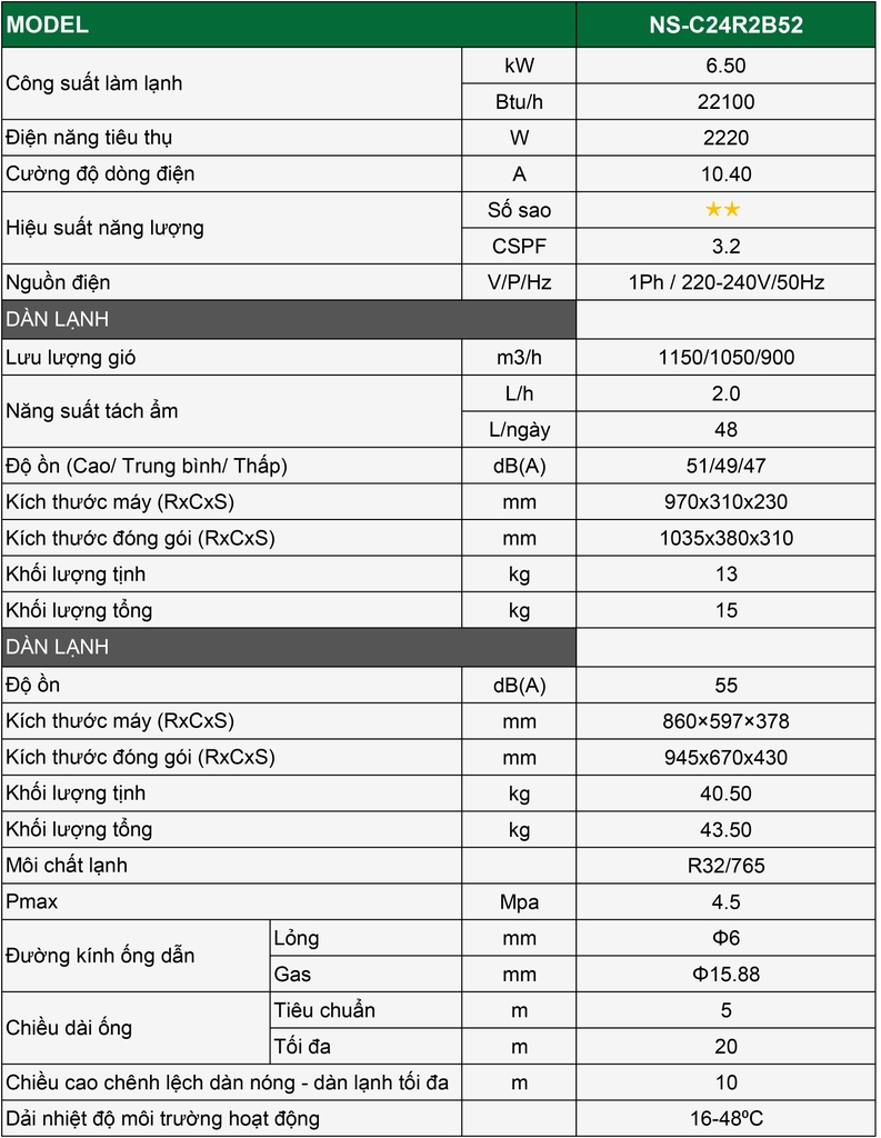 Với những tính năng thông minh và hiệu suất làm mát vượt trội, NS-C24R2B52 là lựa chọn lý tưởng cho không gian rộng, mang đến trải nghiệm thoải mái, tiết kiệm và bền bỉ theo thời gian.