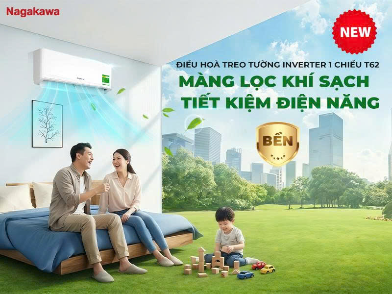 Trước thực trạng chất lượng không khí ngày càng suy giảm cùng thời tiết thay đổi thất thường, ngôi nhà không chỉ cần là nơi để "trú nóng" mà còn phải là vùng xanh an toàn cho sức khỏe hô hấp. Điều hòa treo tường Inverter 1 chiều Nagakawa NIS-C09R2T62 ra đời như một giải pháp 2 trong 1 hoàn hảo: vừa làm mát thông minh, vừa thanh lọc không khí vượt trội. Đây là sự lựa chọn lý tưởng cho các gia đình trẻ muốn tận hưởng sự tiện nghi, mát lành mà vẫn tối ưu chi phí sinh hoạt hàng tháng.