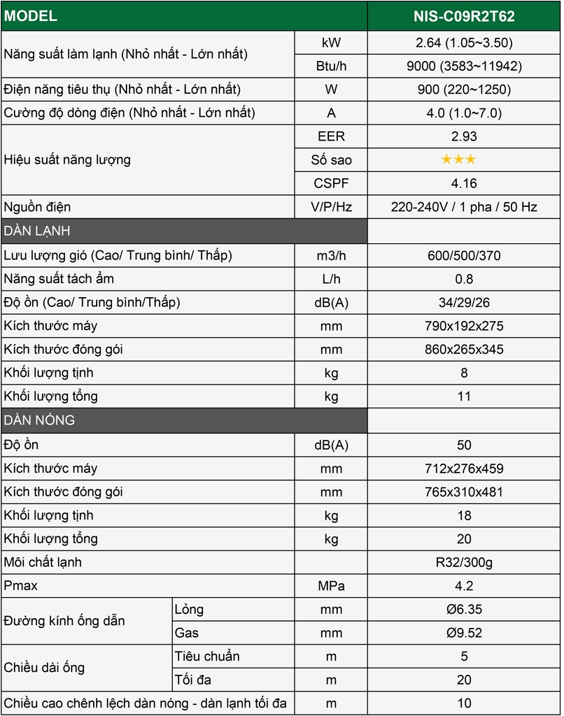Điều hòa treo tường Inverter 1 chiều NIS-C09R2T62 được trang bị công nghệ BLDC Inverter tiên tiến cùng nhãn năng lượng 3 sao. Công nghệ này cho phép máy vận hành êm ái, có khả năng điều chỉnh linh hoạt tốc độ quay của máy nén, giúp duy trì nhiệt độ ổn định và giảm tiêu thụ điện năng lên đến 62% so với các dòng máy thông thường. Kết hợp cùng chế độ Eco, máy hoạt động ở mức công suất thấp nhất nhưng vẫn đảm bảo sự thoải mái tuyệt đối. Bạn có thể thoải mái bật điều hòa suốt đêm hay những ngày nắng nóng mà vẫn bảo đảm ngân sách gia đình.