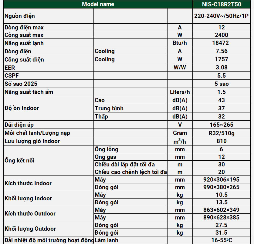 Điều hòa NIS-18R2T50 không chỉ đảm bảo hiệu suất làm mát mạnh mẽ mà còn giảm đáng kể chi phí điện hàng tháng, giúp người dùng an tâm hơn về mặt tài chính. Đồng thời, việc duy trì trạng thái hoạt động êm ái và bền bỉ của máy còn góp phần kéo dài tuổi thọ sản phẩm, mang lại giá trị sử dụng lâu dài và bền vững. Đây là sự lựa chọn lý tưởng cho những ai mong muốn vừa tiết kiệm điện năng vừa đảm bảo sự thoải mái và tiện nghi trong không gian sống.