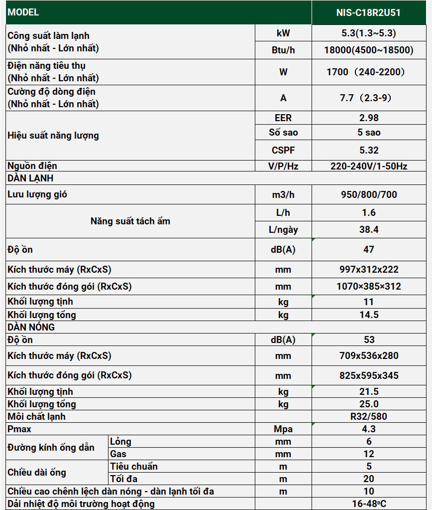 Hoạt động êm ái: Với độ ồn thấp, NIS-C18R2U51 hoạt động êm ái, mang đến không gian yên tĩnh và thư thái cho bạn và gia đình.