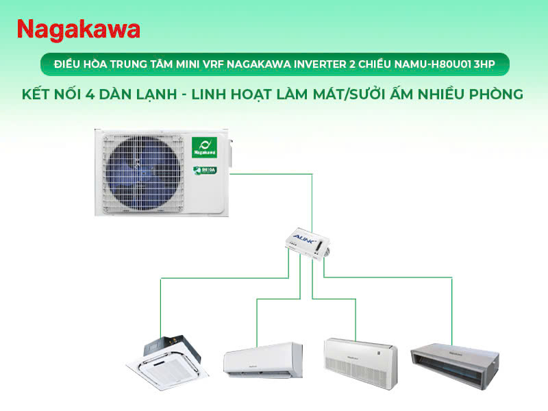 Điều hòa Mini VRF Nagakawa NAMU-H80U01 3HP cho phép kết nối cùng lúc tới 4 dàn lạnh khác nhau tùy theo yêu cầu của chủ đầu tư hay không gian phòng chỉ với một dàn nóng duy nhất. Điều này giúp tiết kiệm không gian lắp đặt ngoài trời và giảm thiểu chi phí đầu tư cho nhiều dàn nóng.