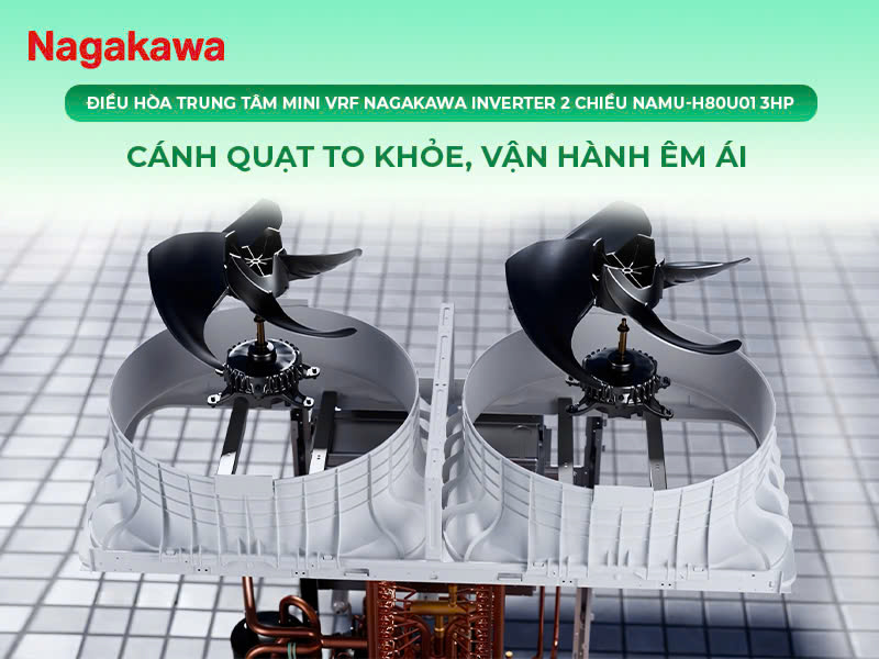 Dàn nóng của NAMU-H80U01 được trang bị động cơ quạt DC nhỏ gọn nhưng mạnh mẽ, cùng với cánh quạt lớn giúp tăng cường lưu lượng gió lên đến 4890m3/h. Điều này đảm bảo rằng luồng không khí lạnh hoặc ấm được phân phối đều khắp không gian, tạo cảm giác thoải mái cho người dùng. Đặc biệt, quạt DC này vận hành êm ái, giảm thiểu tối đa tiếng ồn, phù hợp với các không gian cần sự yên tĩnh.