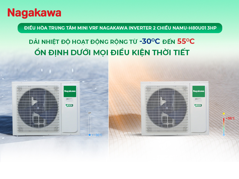 Điều hòa trung tâm Mini VRF Nagakawa có thể hoạt động bền bỉ ngay cả trong các môi trường khắc nghiệt nhất. Sản phẩm có thể làm lạnh ở nhiệt độ ngoài trời từ-15oC đến 49oC và sưởi ấm từ -15oC đến 27oC. Với tính năng này, người dùng hoàn toàn có thể yên tâm sử dụng điều hòa quanh năm, bất kể thời tiết nóng hay lạnh.