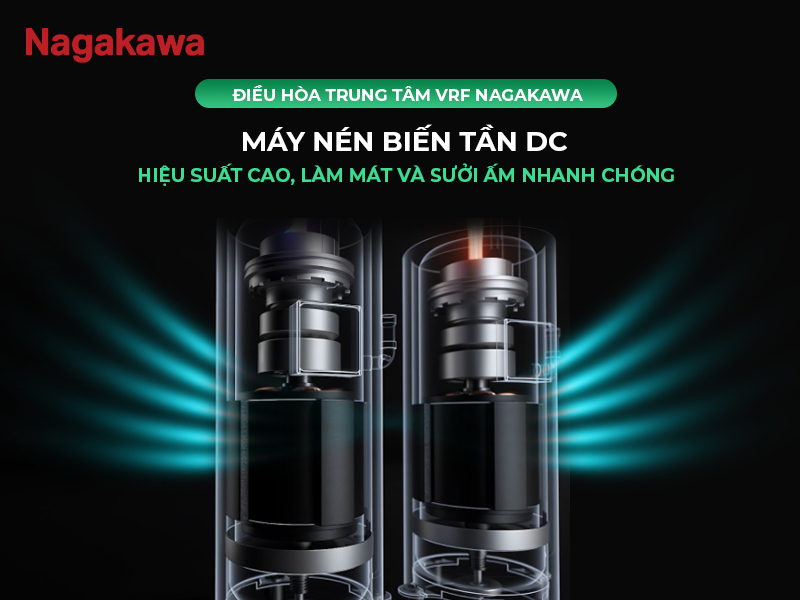 Điều hòa trung tâm VRF Nagakawa được trang bị máy nén Inverter thế hệ mới với công suất lên đến 15% so với máy nén thông thường. Bên cạnh đó, động cơ cánh quạt Inverter với kích thước cánh 750mm giúp tăng thể tích gió lên 5%, mang lại lưu lượng gió mạnh mẽ và ổn định, giúp làm lạnh và sưởi ấm nhanh chóng mà vẫn tối ưu hóa điện năng tiêu thụ, giúp người dùng tiết kiệm chi phí sử dụng.